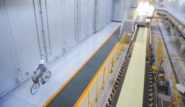 吉野石膏の工場では、機械系・電気系社員中心のエンジニアリング部によって、生産設備を自前で設計・開発し、製造管理、導入まで行っています。オリジナルで開発する設備には高水準の新技術が導入されており、とりわけ生産スピードの早さ、稼働率の高さ、歩留まり率の高さ(=不良品発生率の低さ)といった「3つの技術力」は、世界的にも業界屈指と言われます。