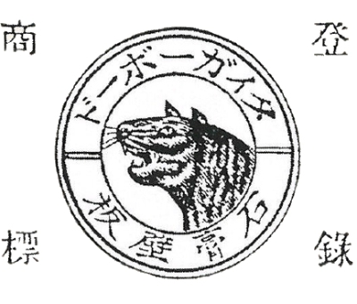 最初のタイガーボードに使われたマーク。二重円の中には「タイガーボード」「石膏壁板」の文字が右から左へと横書きされている。タイガーは左横向きで斜め上を見、首まで描かれている。