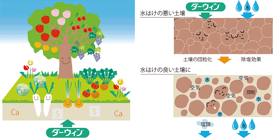 硫酸カルシウム(せっこう:CaSO4)が主原料の「ダーウィン」はカルシウム(Ca)と硫黄(S)を含んだ効果的な肥料、カルシウム肥料です。土にまくタイプと葉面・果面に散布するタイプがあります。併用することで作物のさらなる成育が期待できます。また、肥料効果だけでなく、塩害で作物が育ちにくい土壌を改良して、豊かな土壌にする効果も期待できます。(土壌改良:団粒化および除塩)